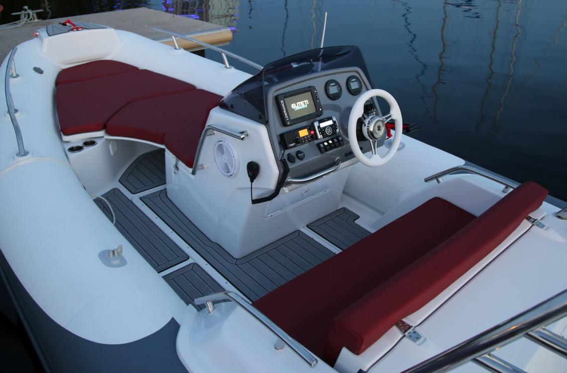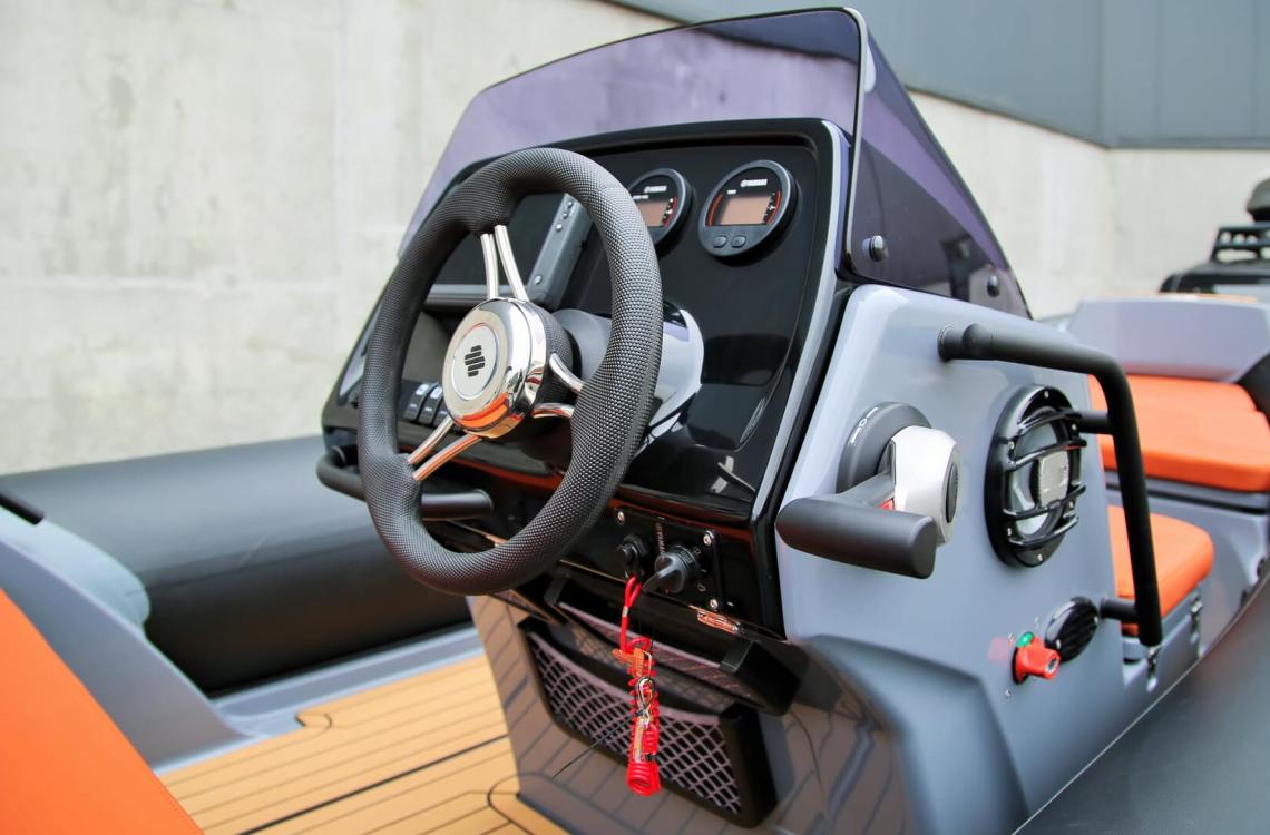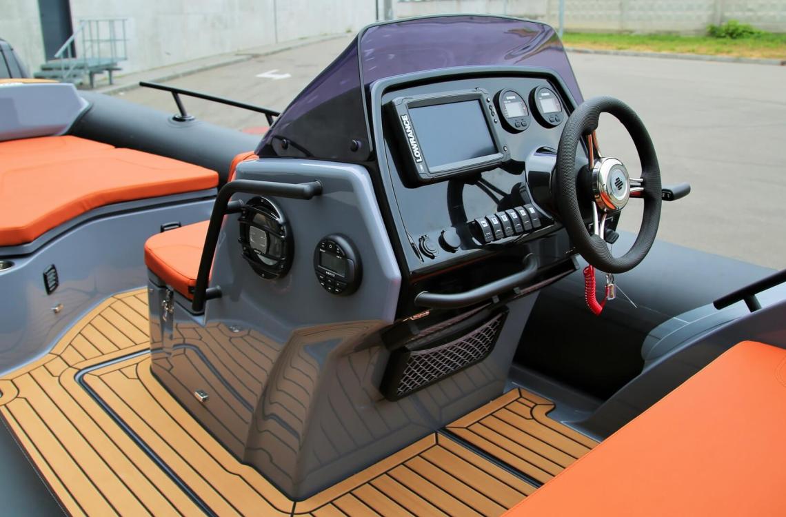 Конструкція передбачає місткі носові відсіки для зберігання, бічну кермову консоль і зручний кормовий диван. Панель приладів дозволяє встановити сучасне навігаційне обладнання, зокрема дисплей до 10 дюймів. Комфортні сидіння з морських матеріалів забезпечують зручність під час руху та відпочинку.
